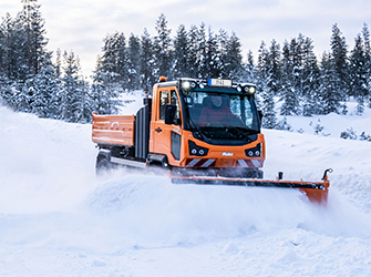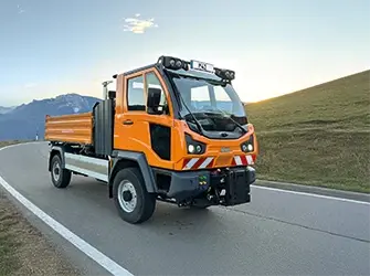 The permanent all-wheel drive and standard differential locks increase traction and manoeuvrability even in demanding terrain. The climbing ability at full operating weight is approx. 45%, and despite the heavy vehicle class, it is even 100% at empty weight. The standard hill hold function keeps the vehicle in position when stopping on a slope until the electric parking brake is automatically applied. This means no rolling back and easy starting at any time.