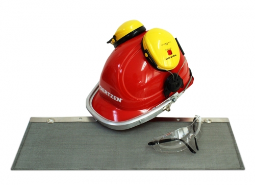mit Drahtgittervisier, Gehörschutz und Schutzbrille