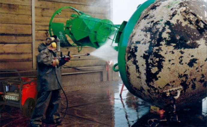 kleinflächig arbeitender Wasser-Sandstrahler für abrasive Oberflächenbearbeitung: Farbentfernung, Entlackung, Entrostung, Betonsanierung